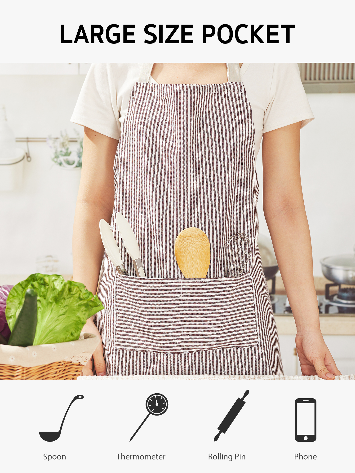 • Convenient large pockets – This chefs apron features 2 handy pockets that are large enough to hold tools, recipe cards, and your phone. The pockets are strategically placed to ensure easy access and maximum convenience.